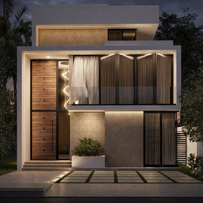 La fachada se compone de volúmenes rectangulares enmarcados que generan profundidad y jerarquía visual. El contraste entre aplanados en tonos claros, revestimientos tipo piedra natural y madera vertical en acceso principal aporta calidez y sofisticación a la composición arquitectónica. La cancelería en tonos oscuros y el barandal de cristal refuerzan el lenguaje moderno de la vivienda.